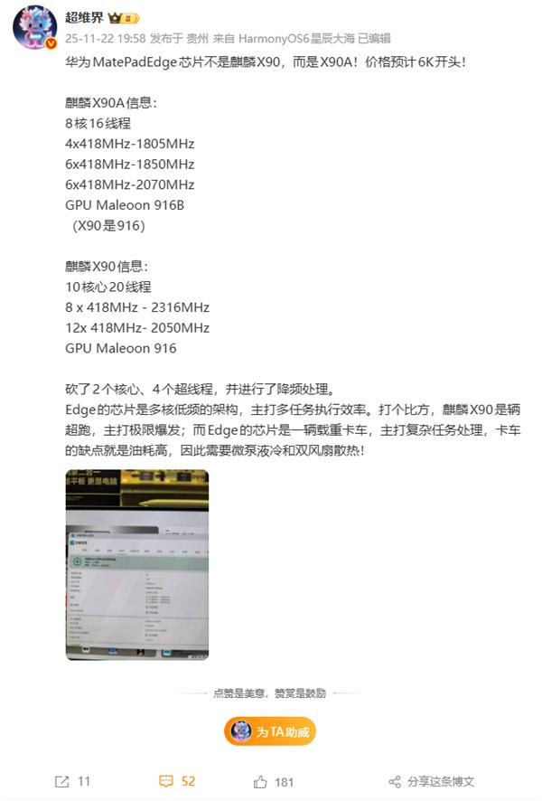 从博主“超维界”此前公布的参数来看,8核版本对应麒麟X90A。